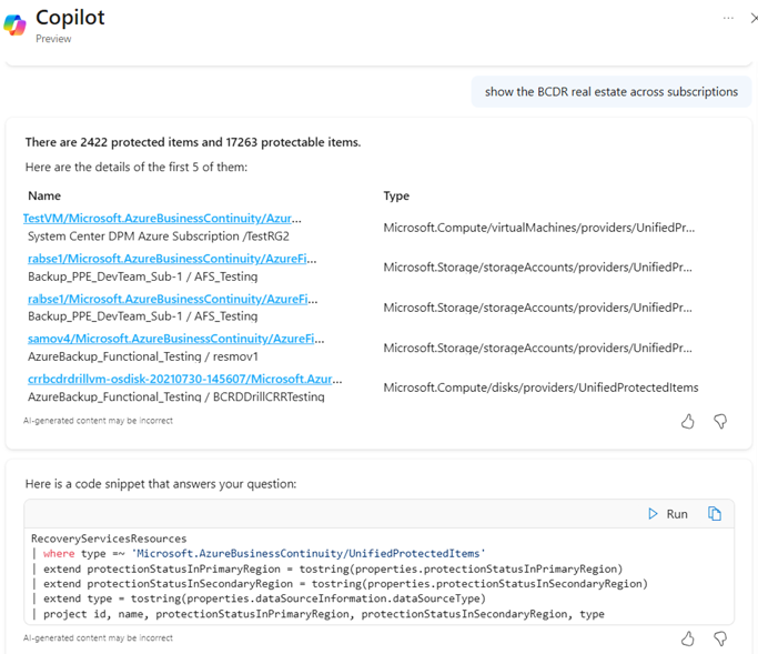 就 Azure 中的复原能力询问 Copilot,通过“显示所有订阅中的复原能力资产”等提示获取有关资源保护的信息。