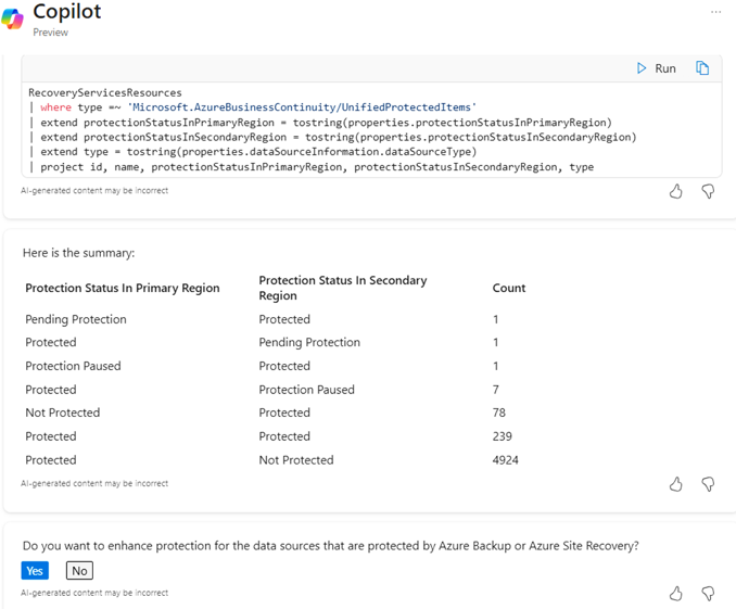 Copilot 根据保护状态提供资源摘要,并生成一个 Azure Resource Graph (ARG) 查询,你可以直接运行该查询以获取详细信息。 此外,还可以从 ARG 查询资源管理器页将数据导出为 CSV 文件。