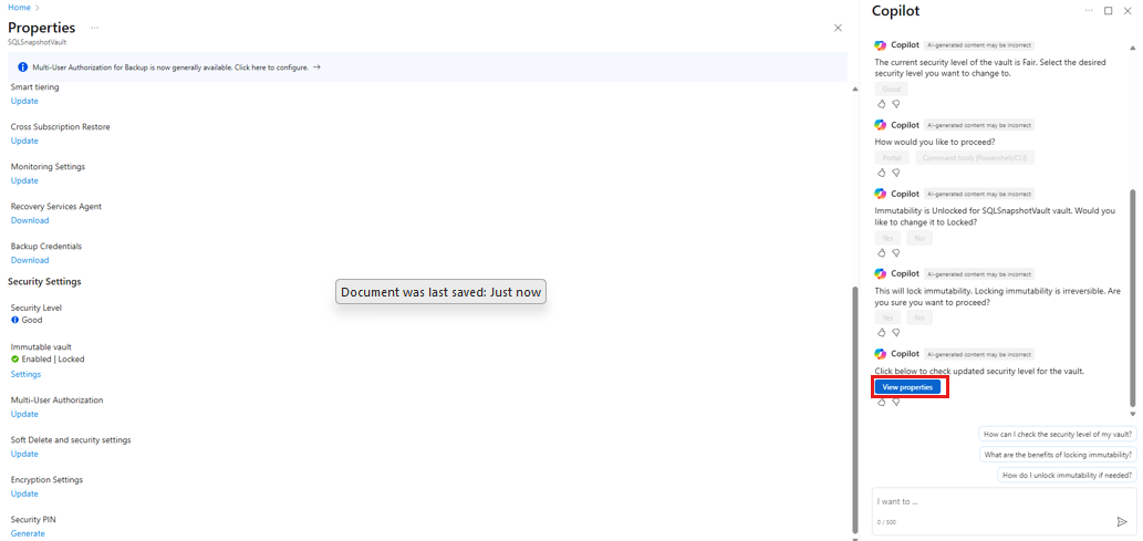 使用 Copilot 更新保管库安全级别后,选择“ 查看属性 ”以检查更新的值。