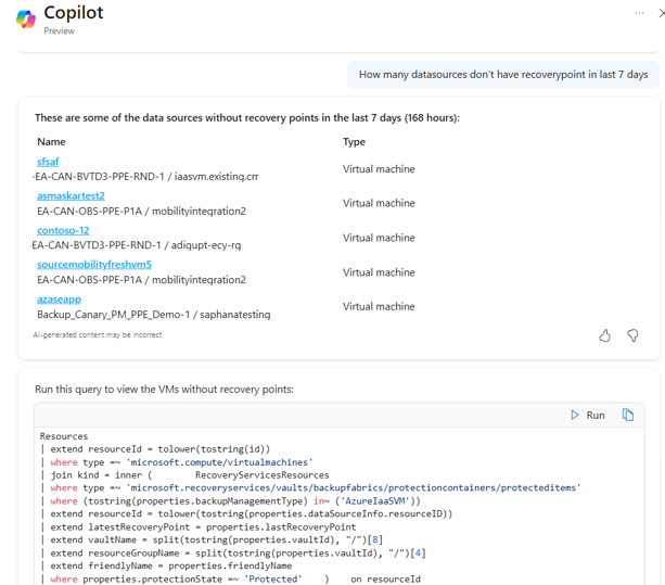 Copilot 可以帮助你获取在指定持续时间内没有任何恢复点的数据源列表。 此功能有助于监控任何备份失败,并确保恢复过程符合服务级别协议 (SLA)。