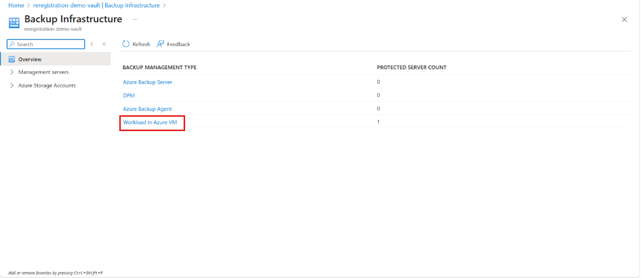 转到要从中注销基础数据源的 恢复服务保管库 ,然后选择“ 管理>备份基础结构”。