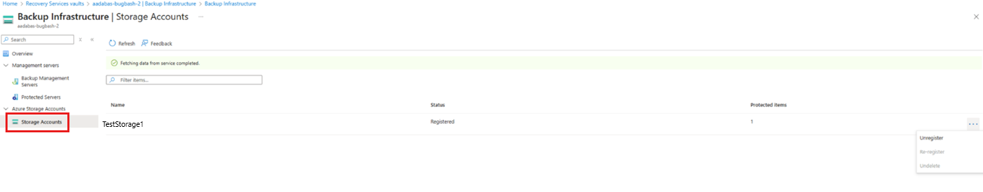 - 注销 Mercury 工作负荷的基础存储帐户(Azure VM 中的 SQL 数据库、Azure VM 中的 SAP 数据库、Azure 文件存储)。 在取消注册关联的存储帐户之前,不允许对数据源进行备份重新配置。