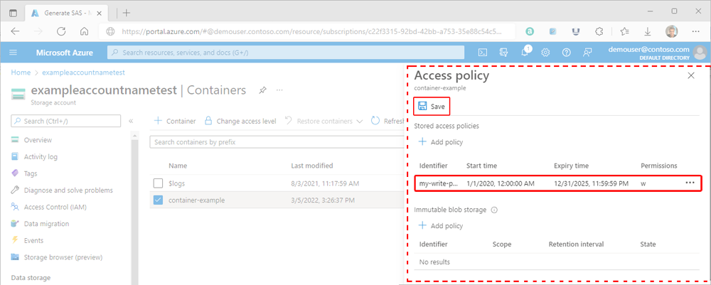在 “访问策略 ”窗格中,选择“ + 添加策略 ”以定义其他策略,或选择“ 保存 ”将新策略应用到容器。 创建至少一个存储访问策略后,你将能够将其他安全访问签名(SAS)与其相关联。