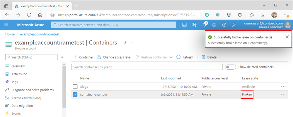 容器租约用于建立或管理用于删除操作的锁定。 在 Azure 门户中获取租约时,只能创建具有无限持续时间的锁。 以编程方式创建时,锁定持续时间可以介于 15 到 60 秒之间,也可以是无限的。