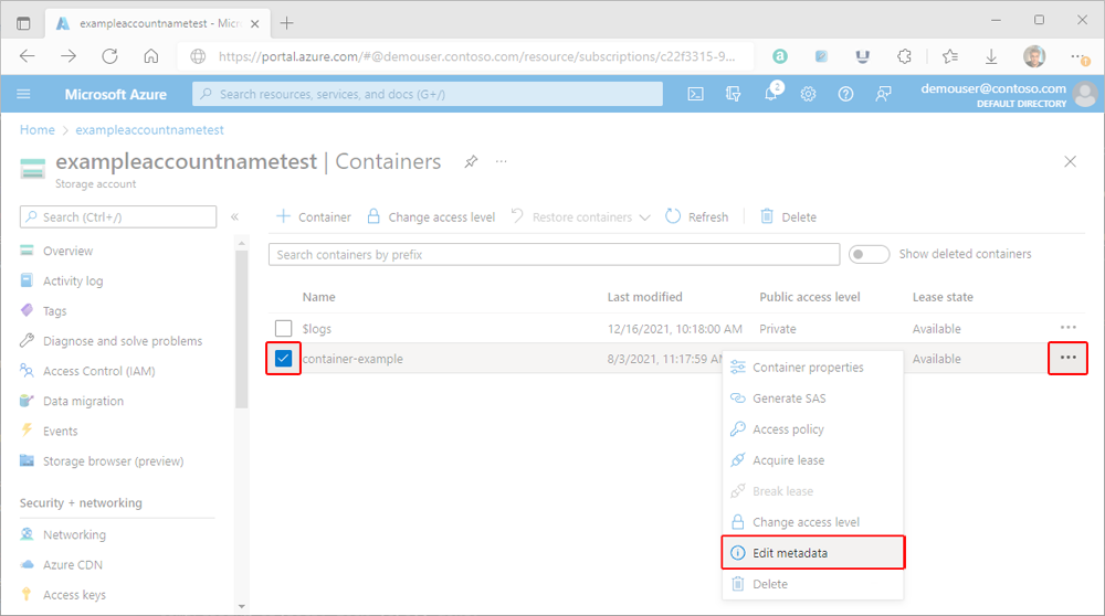 选择容器的 “更多 ”按钮(...),然后选择 “编辑元数据 ”以显示 “容器元数据 ”窗格。