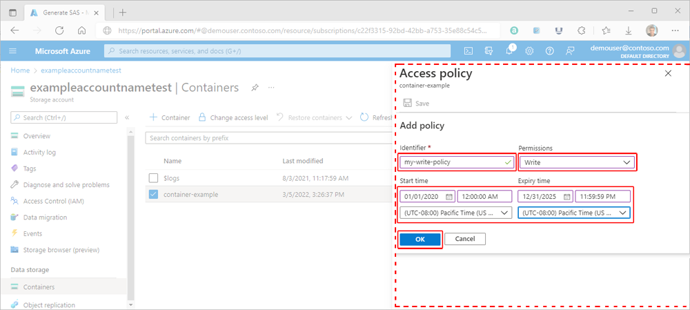 选择容器的 “更多 ”按钮(...),然后选择 “访问策略 ”以显示 “访问策略 ”窗格。