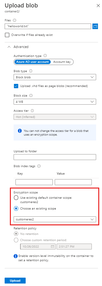 若要通过 Azure 门户上传具有加密范围的 Blob,请先创建 加密范围,如“创建加密范围”中所述。 接下来,按照以下步骤创建 Blob: