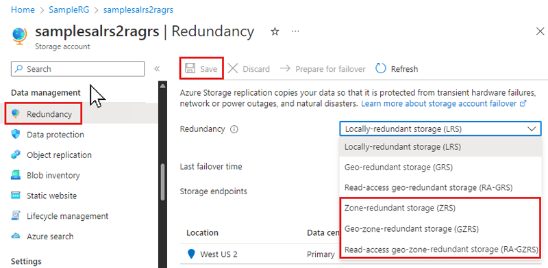 - 如何在主要区域中复制数据。 可以使用本地冗余存储 (LRS) 在本地复制主要区域中的数据,也可以使用区域冗余存储 (ZRS)跨 Azure 可用性区域复制数据。