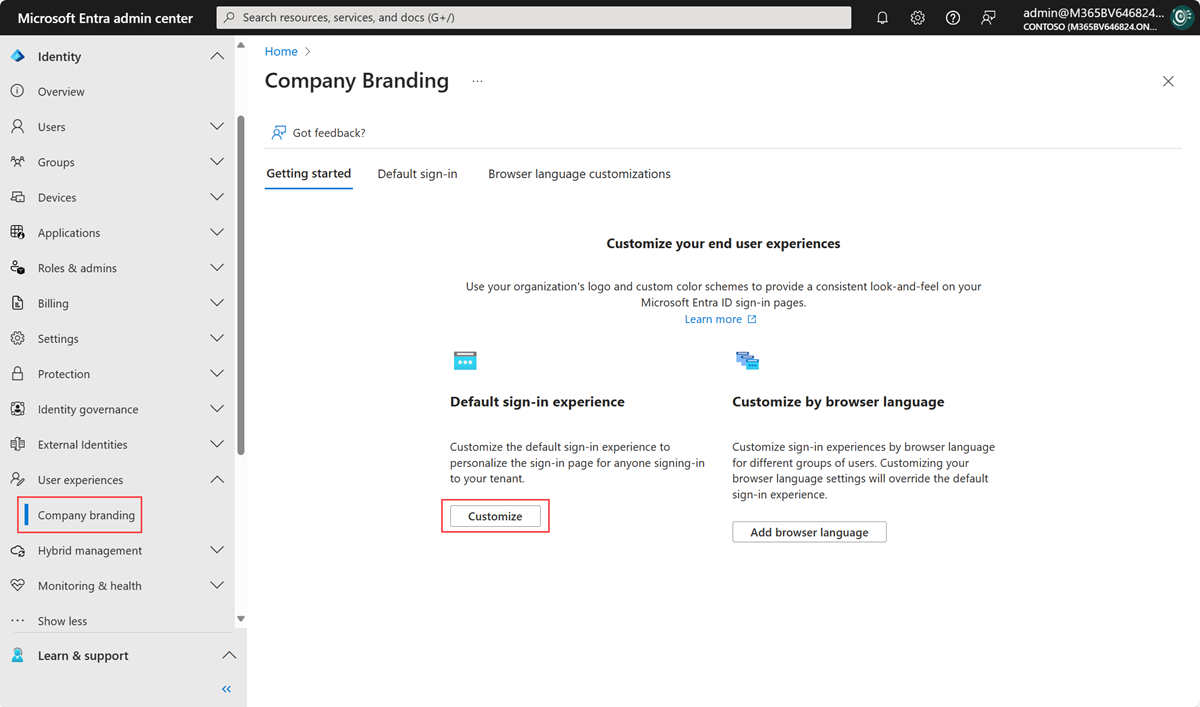默认登录体验是应用于租户的所有登录的全局外观。 在自定义任何设置之前,登录页面中将显示默认的 Microsoft 品牌打造。 可以使用自定义背景图像或颜色、网站图标、布局、页眉和页脚自定义此默认体验。 还可以上传自定义 CSS 文件。