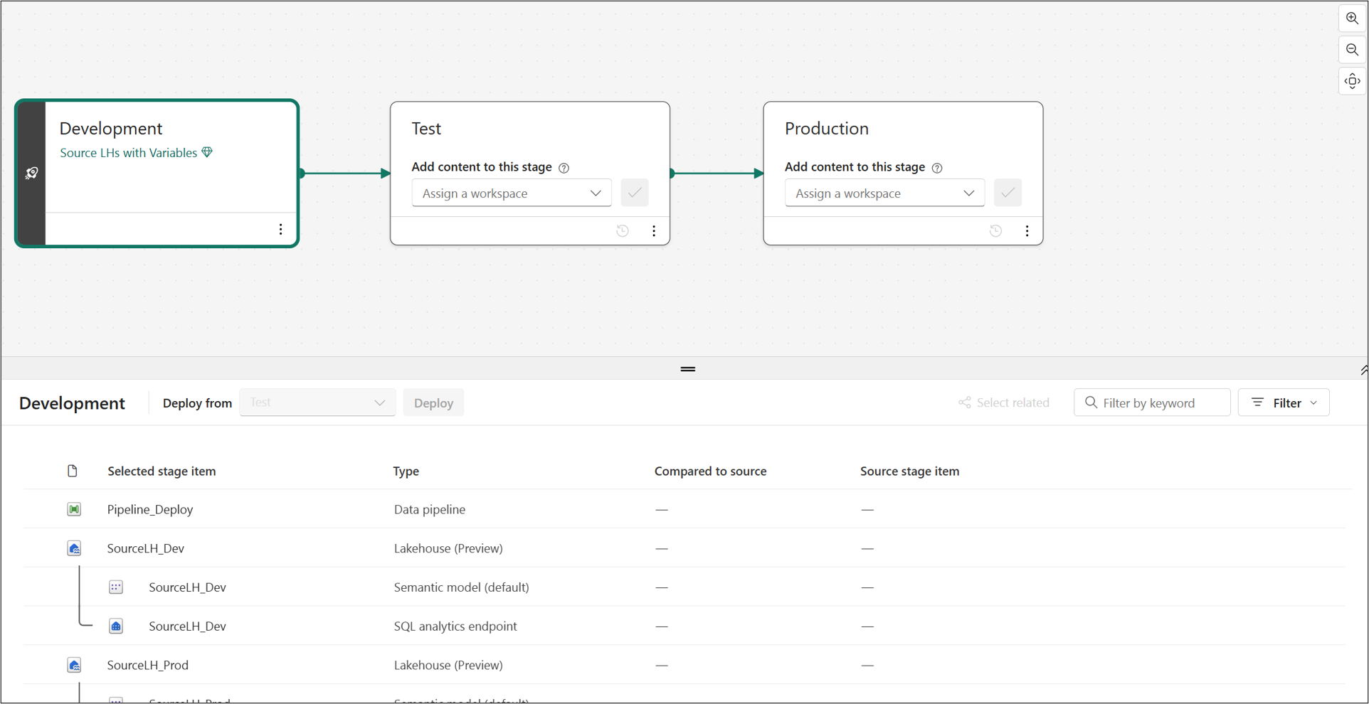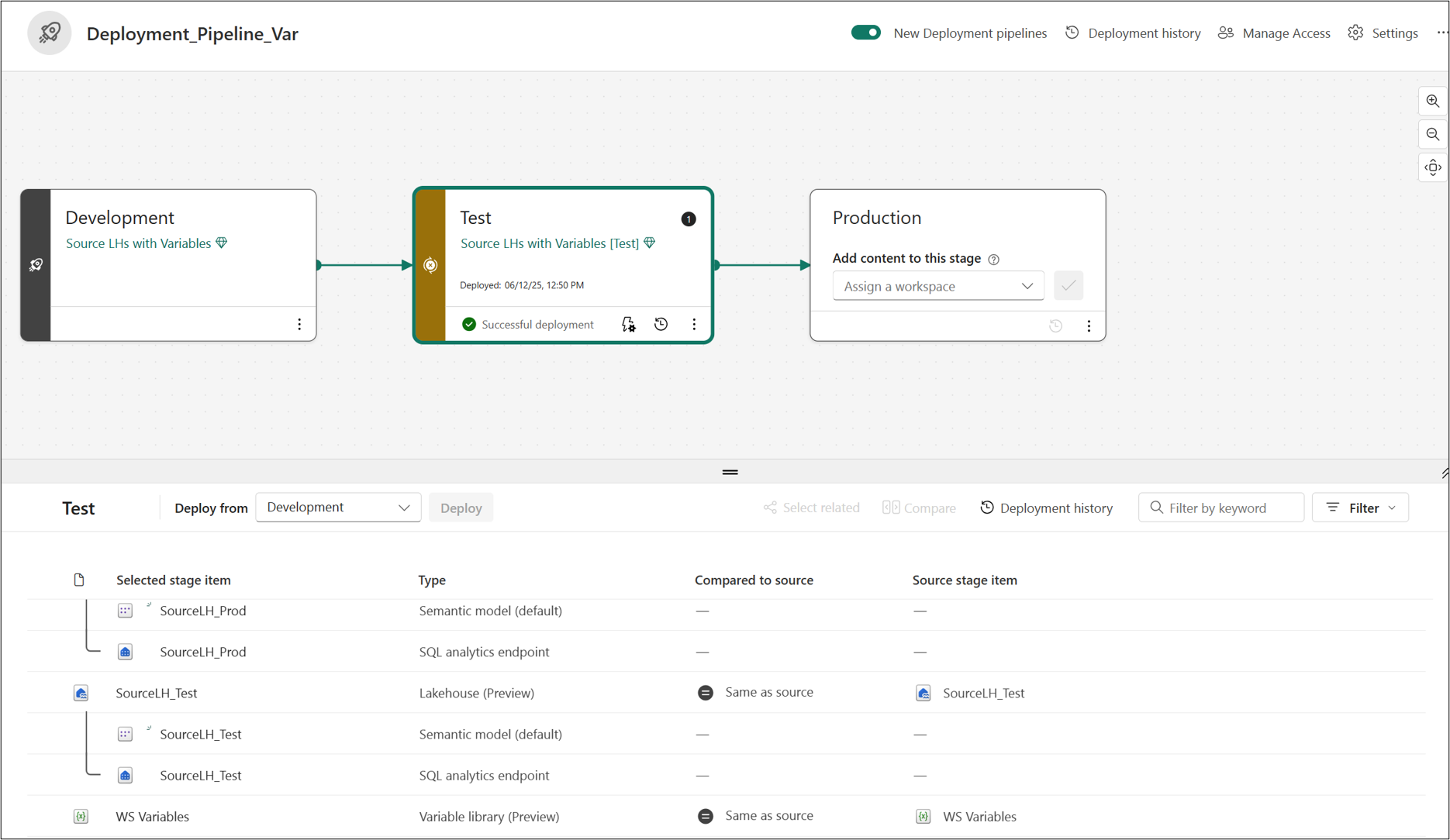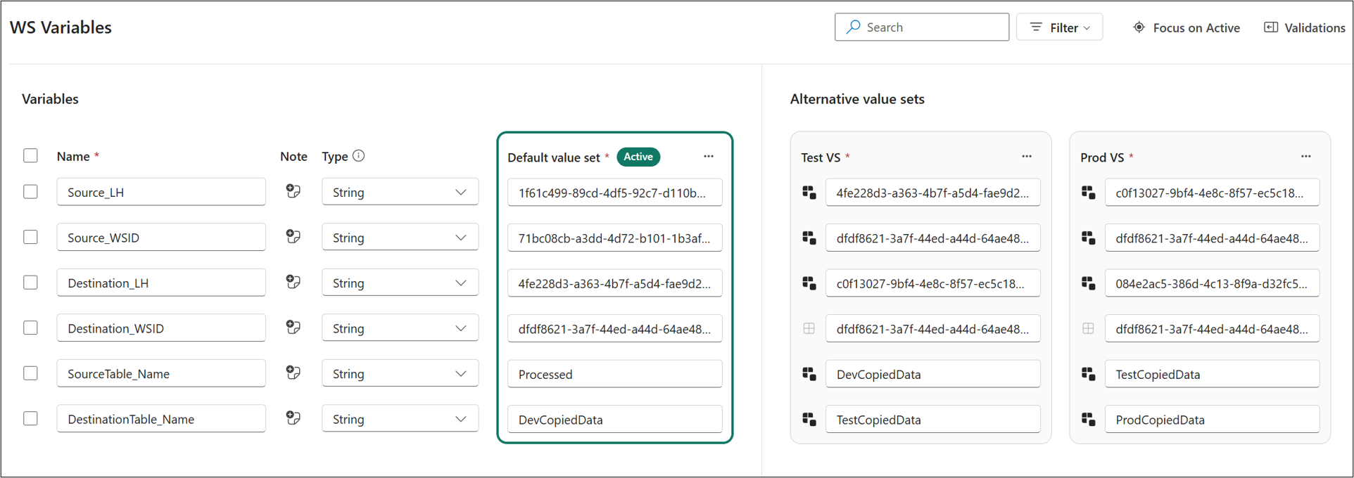 对源 LHs 中的“变量”工作区中的SourceLH_Dev和SourceLH_Test lakehouse 重复上述步骤。