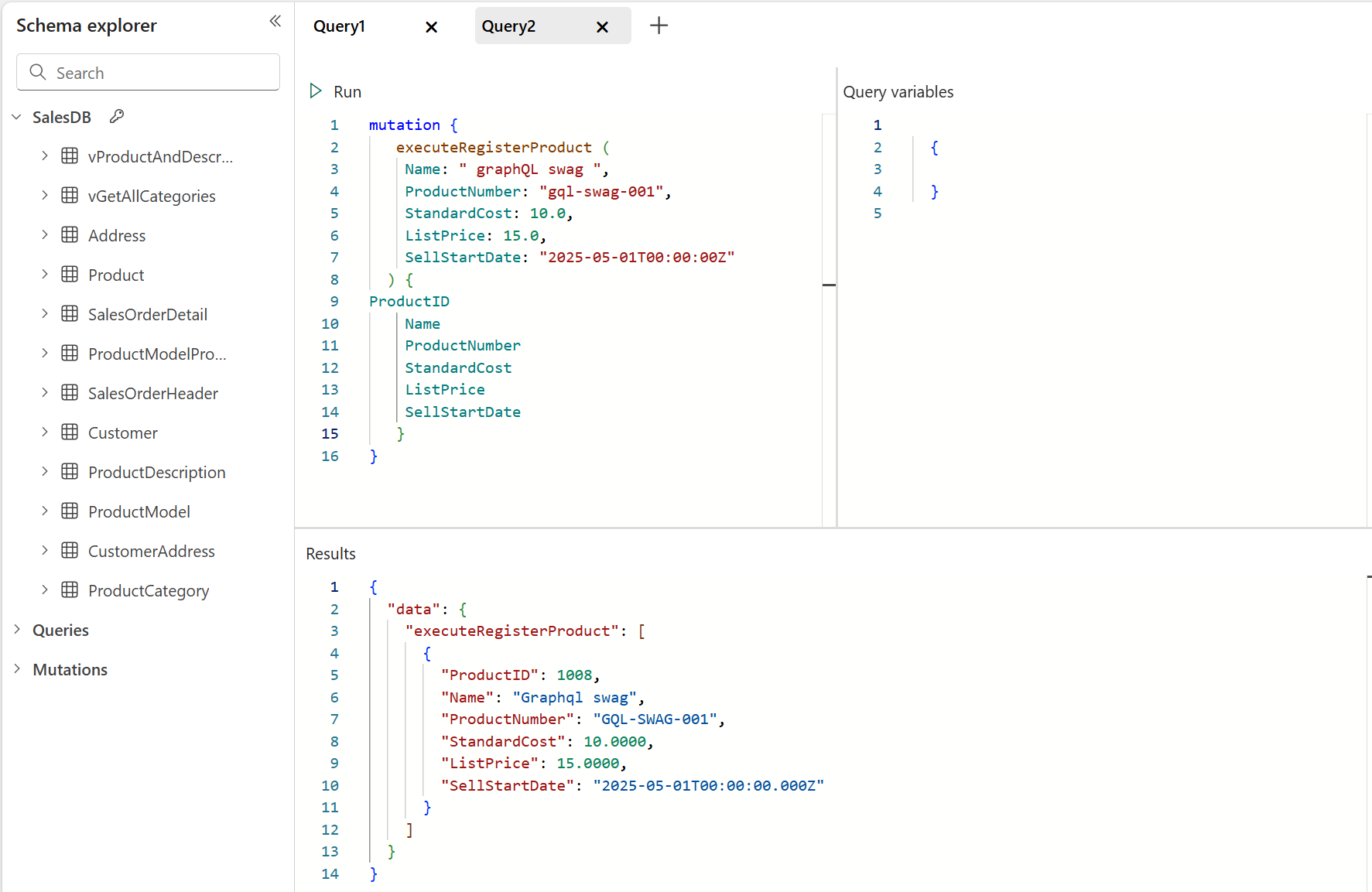 API 准备就绪后,存储过程将作为一个变更在 Fabric GraphQL 模式中可用。 去查询编辑器并执行以下变更: