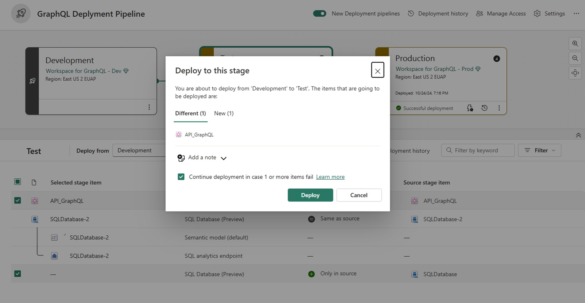 - 选择需要部署的项。 选择“ 部署 ”以跨开发、测试和生产阶段部署所选项(GraphQL 的 API 及其连接的数据源)。