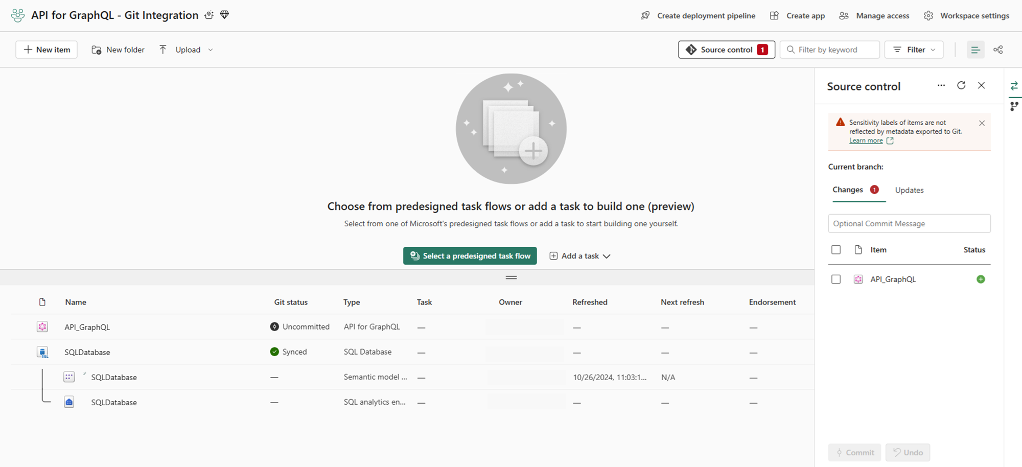 用于 GraphQL 的 Fabric API 为源代码管理提供 Git 集成。 借助 Git 集成,可以备份和版本控制 GraphQL 的 API,根据需要还原到以前的阶段,使用 Git 分支单独协作或单独工作,并在 Fabric 中完全管理 GraphQL 生命周期的 API。