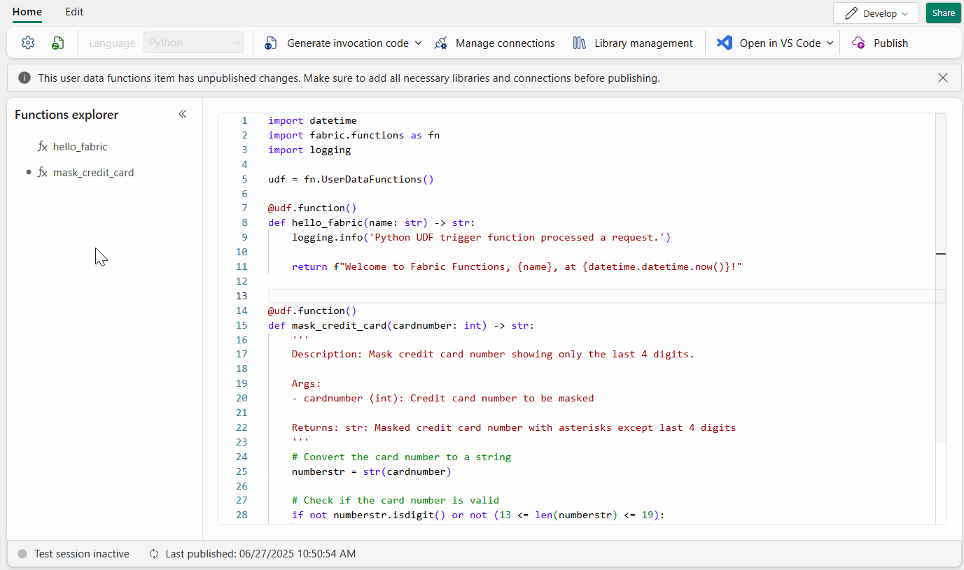 Fabric 用户数据函数提供在 Fabric 门户中或使用 VS Code 扩展测试和验证代码更改的功能。 这些功能有助于确保函数可以成功运行,而无需发布它们。