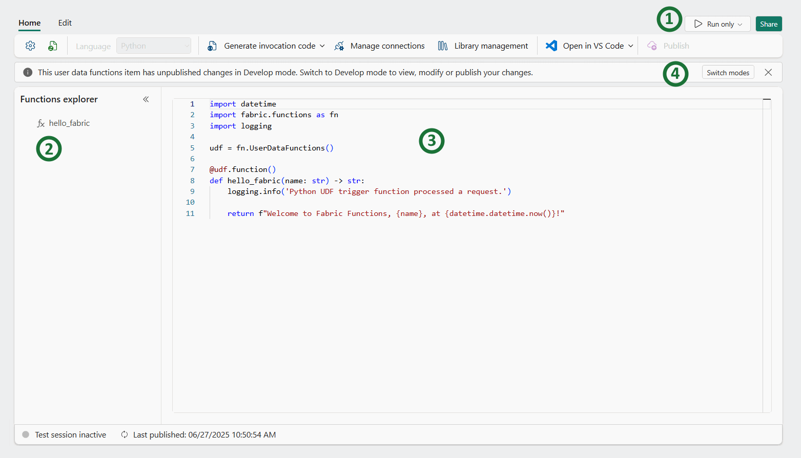 Fabric 用户数据函数提供两种模式,用于在 Fabric 门户中与函数交互: 开发模式 和 仅运行/查看模式。 可以在用户数据函数页面右上角找到模式切换器。