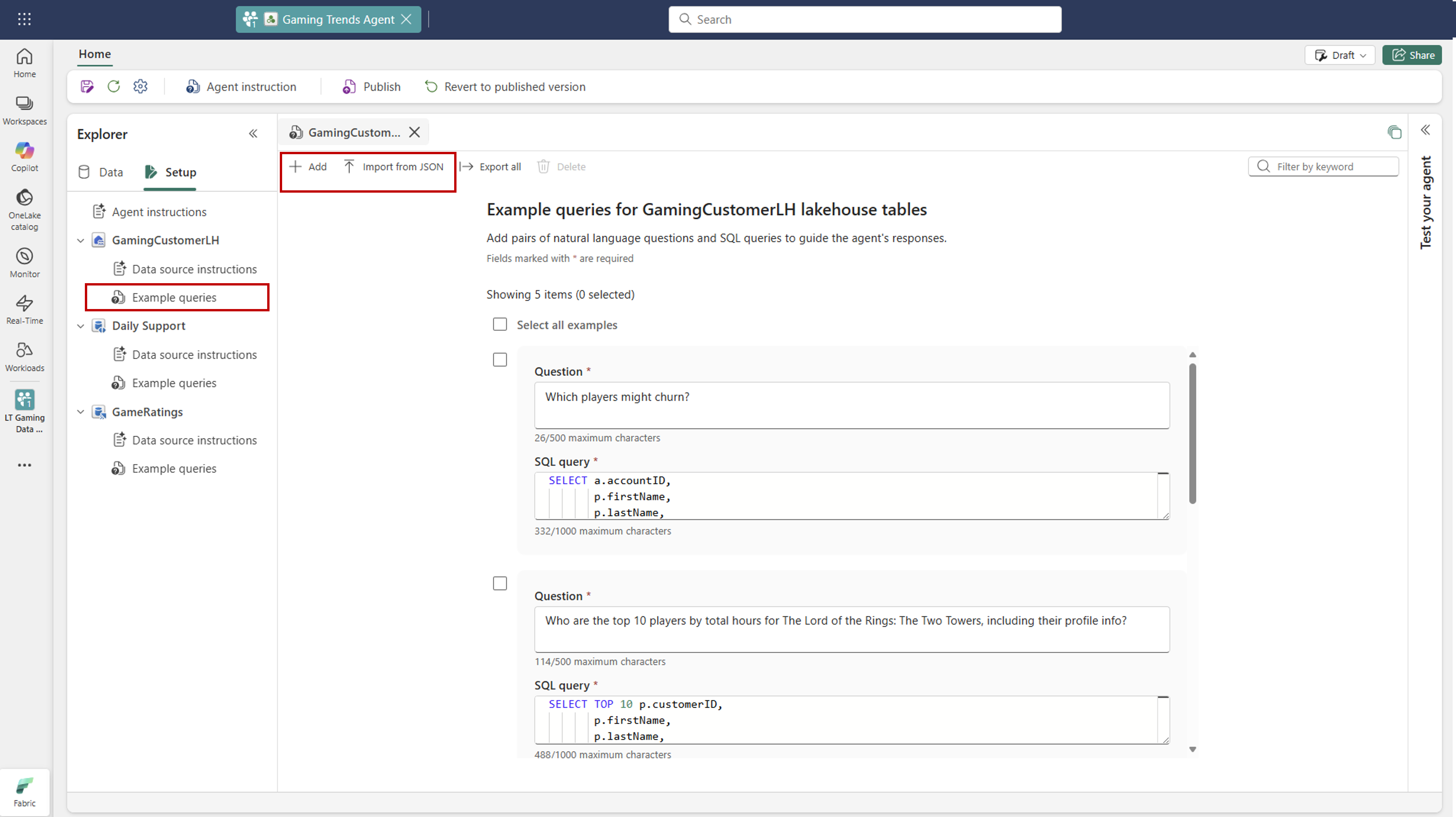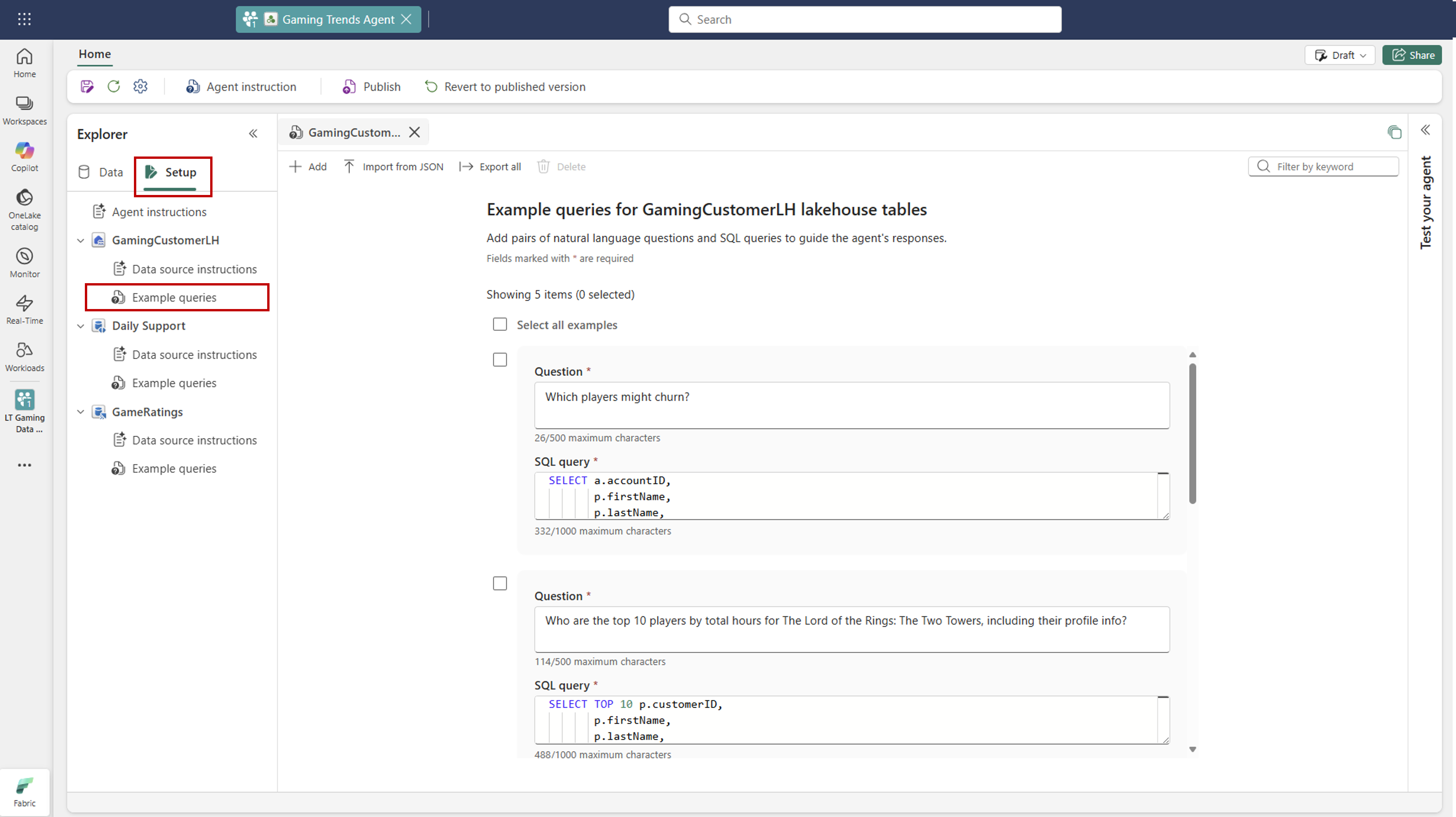 - 示例和说明:设置 Fabric 数据代理时提供的任何预定义示例(例如示例问题和答案)或特定说明。 这些示例和说明有助于优化 AI 对问题的理解,并指导 AI 如何与数据交互。