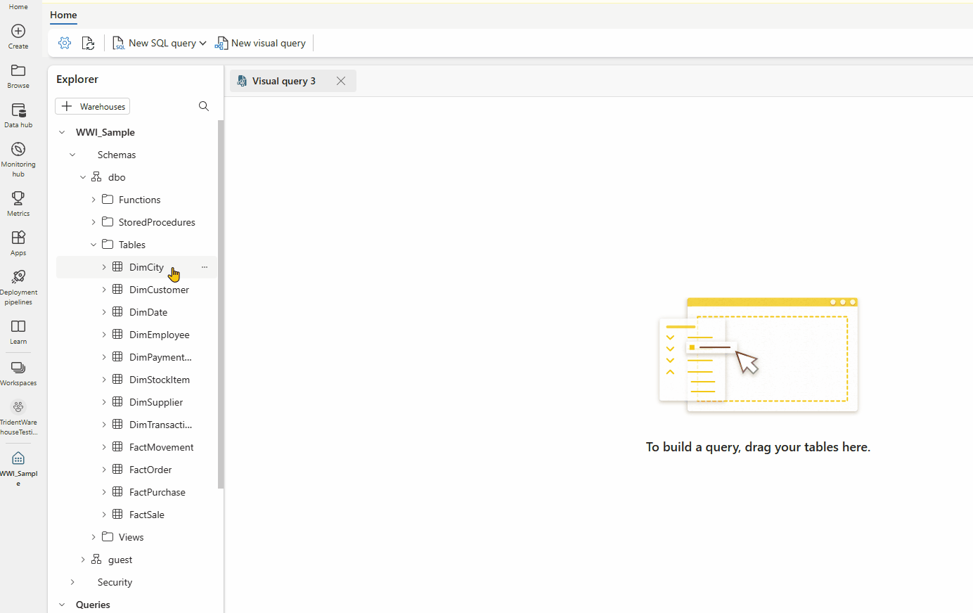 要创建查询,请将表从“对象资源管理器”拖放到画布上。 若要拖动表,请选择并按住该表,直到你在拖动前看到它已从“对象资源管理器”中选取。 将一个或多个表拖到画布上后,你就可以使用视觉对象体验来设计查询。 仓库编辑器使用 Power Query 关系图视图体验,使你能够轻松查询和分析数据。 详细了解 Power Query 关系图视图