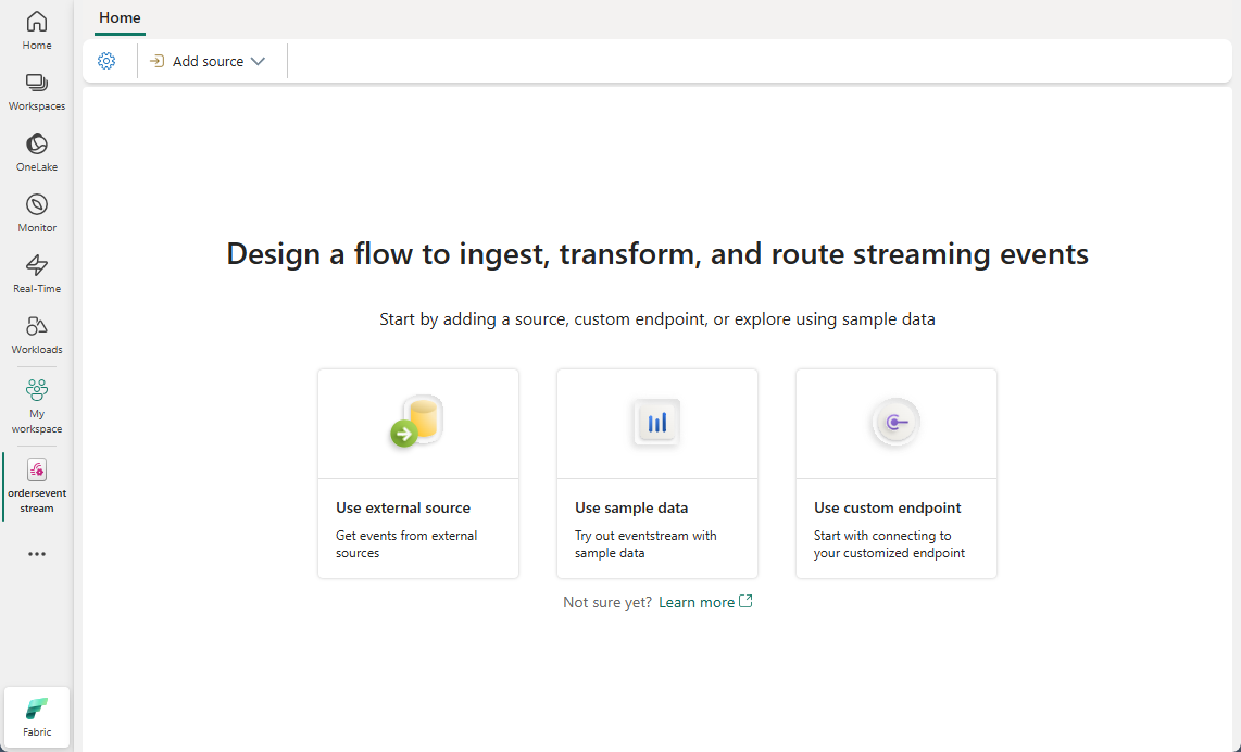 在工作区中创建新 eventstream 可能需要几秒钟时间。 创建事件流 后,将跳转到主编辑器,可以在其中开始向事件流添加源。
