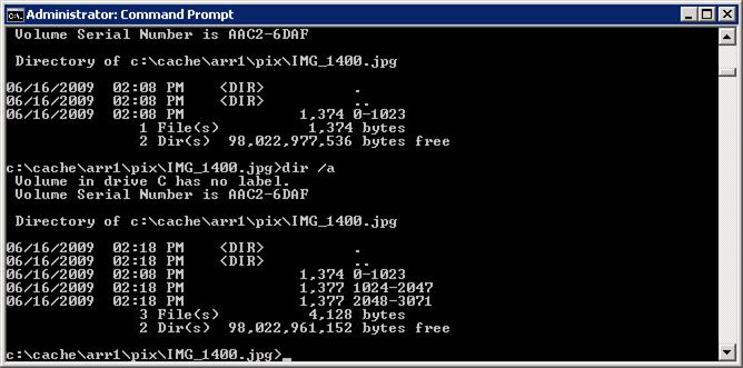 在缓存驱动器位置找到 IMG_1400.jpg 所在的文件夹,并键入“dir /a”以列出内容。