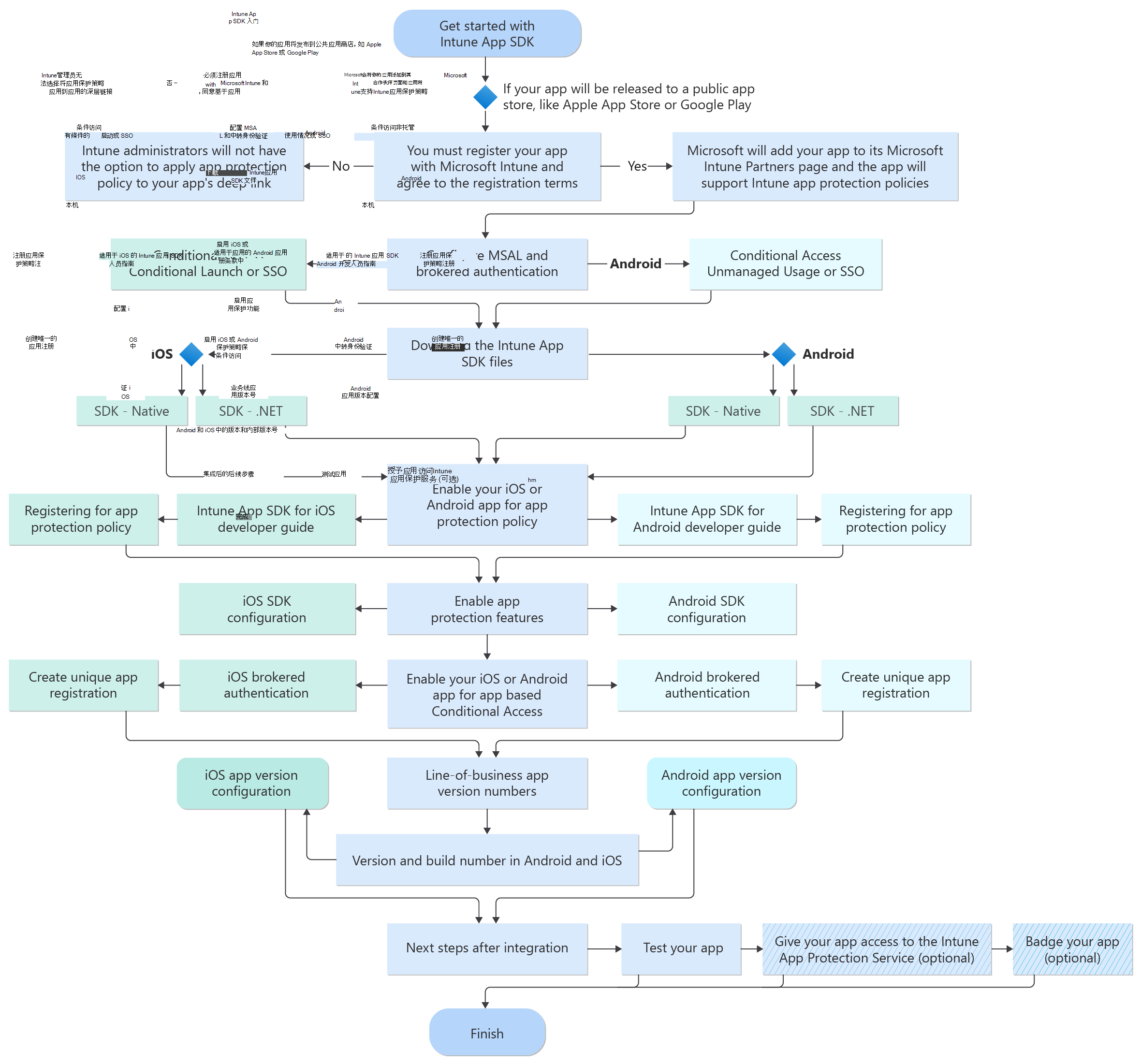 下图提供了适用于 iOS 的 Intune App SDK 和适用于 Android 的 Intune App SDK 的进程流: