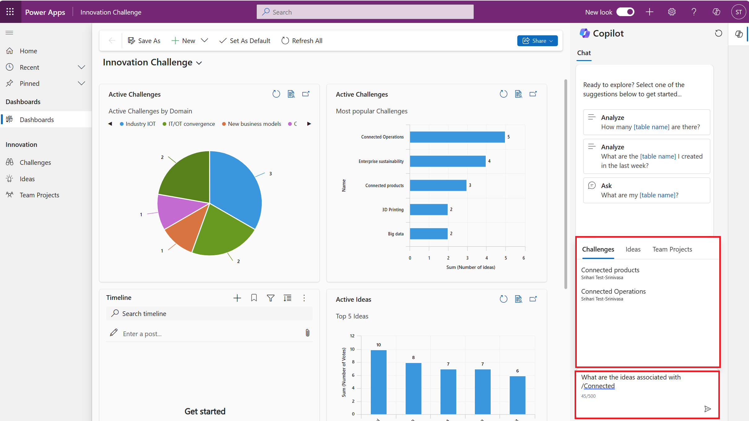 模型驱动应用中的 Copilot 聊天可以回答有关应用中 Dataverse 表数据的问题。 它还可以帮助你导航应用。 例如,如果输入 “导航到挑战”,Copilot 会自动在应用中打开相关页面。