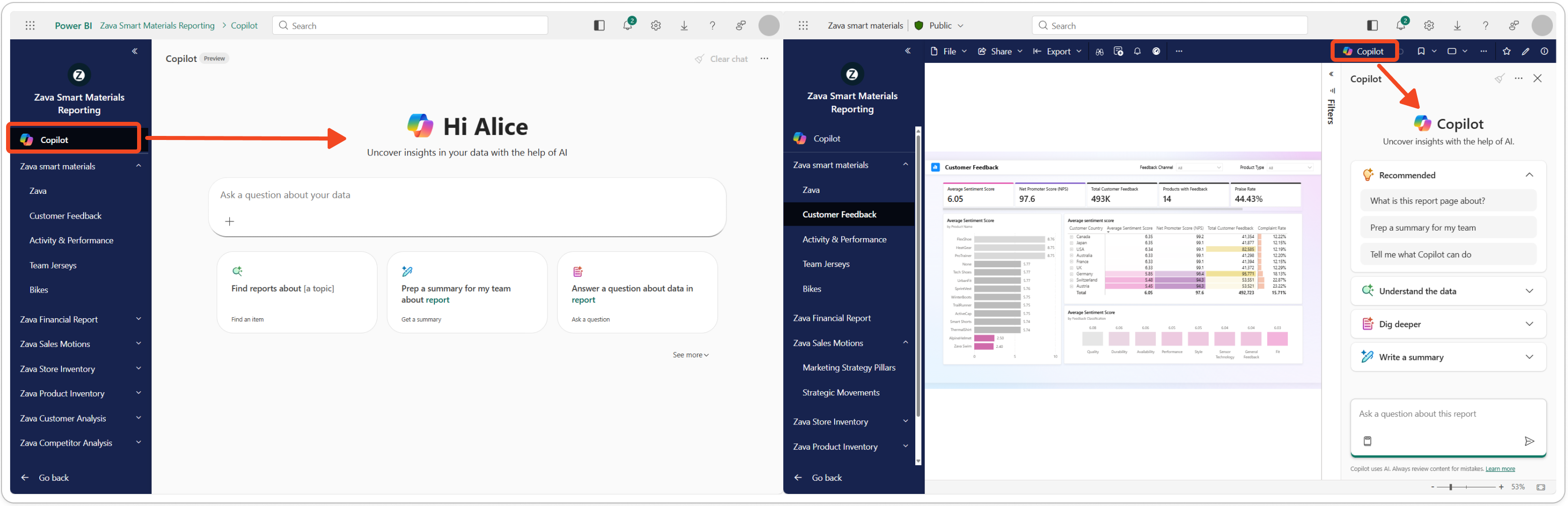 应用范围内的 Copilot 体验可以汇总报表中的数据,并使用报表视觉对象回答特定问题。 如果在报表中找不到答案, Copilot 则默认使用语义模型为用户生成丰富的答案。 详细了解如何 询问有关数据的问题。