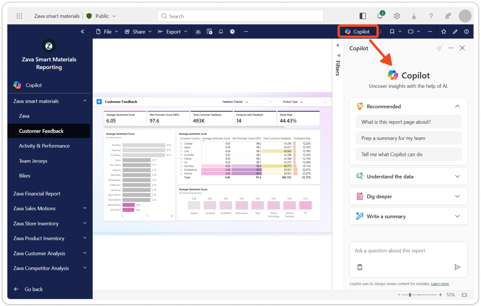 Copilot 可以提供有关整个报表或该报表中特定主题的摘要。 可以使用如下所示的提示:
