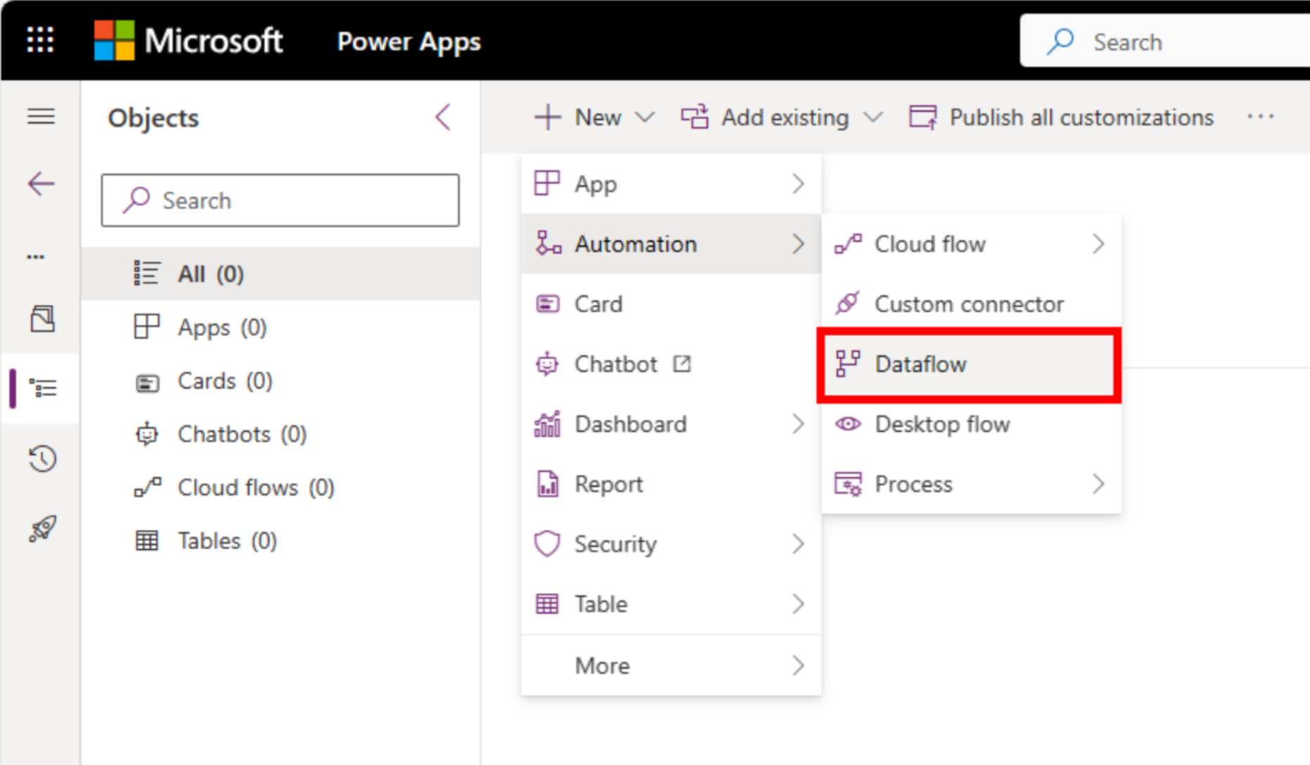 从菜单中选择 新建,然后导航到 自动化>数据流。