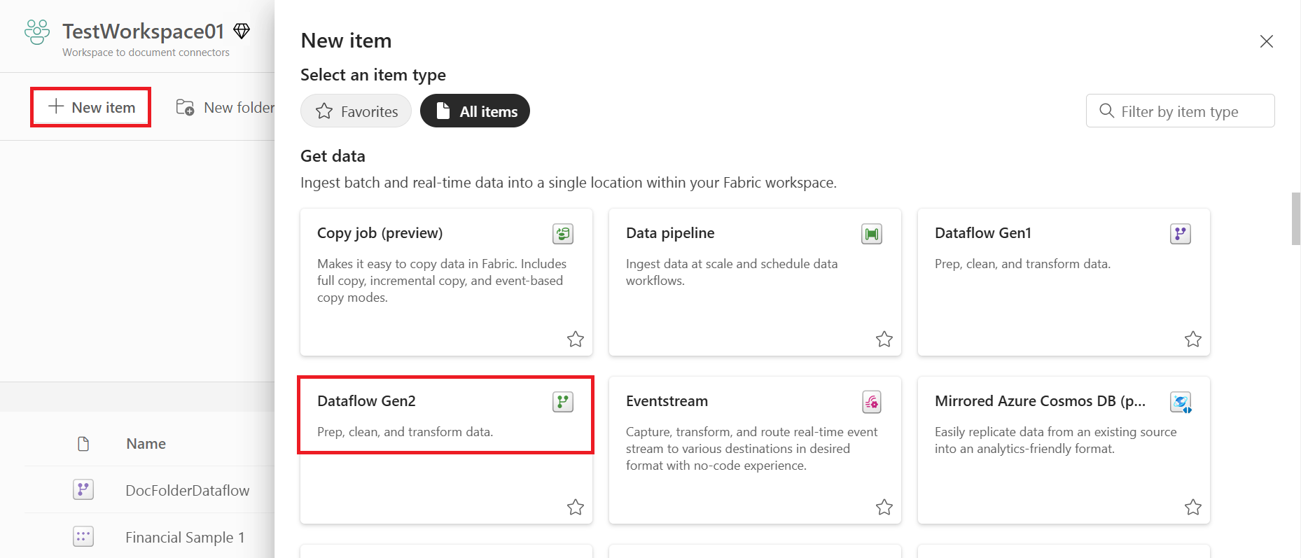 从工作区(在本示例中为 TestWorkspace01)中选择 新项。