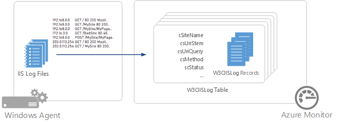 Internet Information Services (IIS) 会将用户活动记录在日志文件中,这些文件可由 Log Analytics 代理收集并存储在 Azure Monitor 日志中。