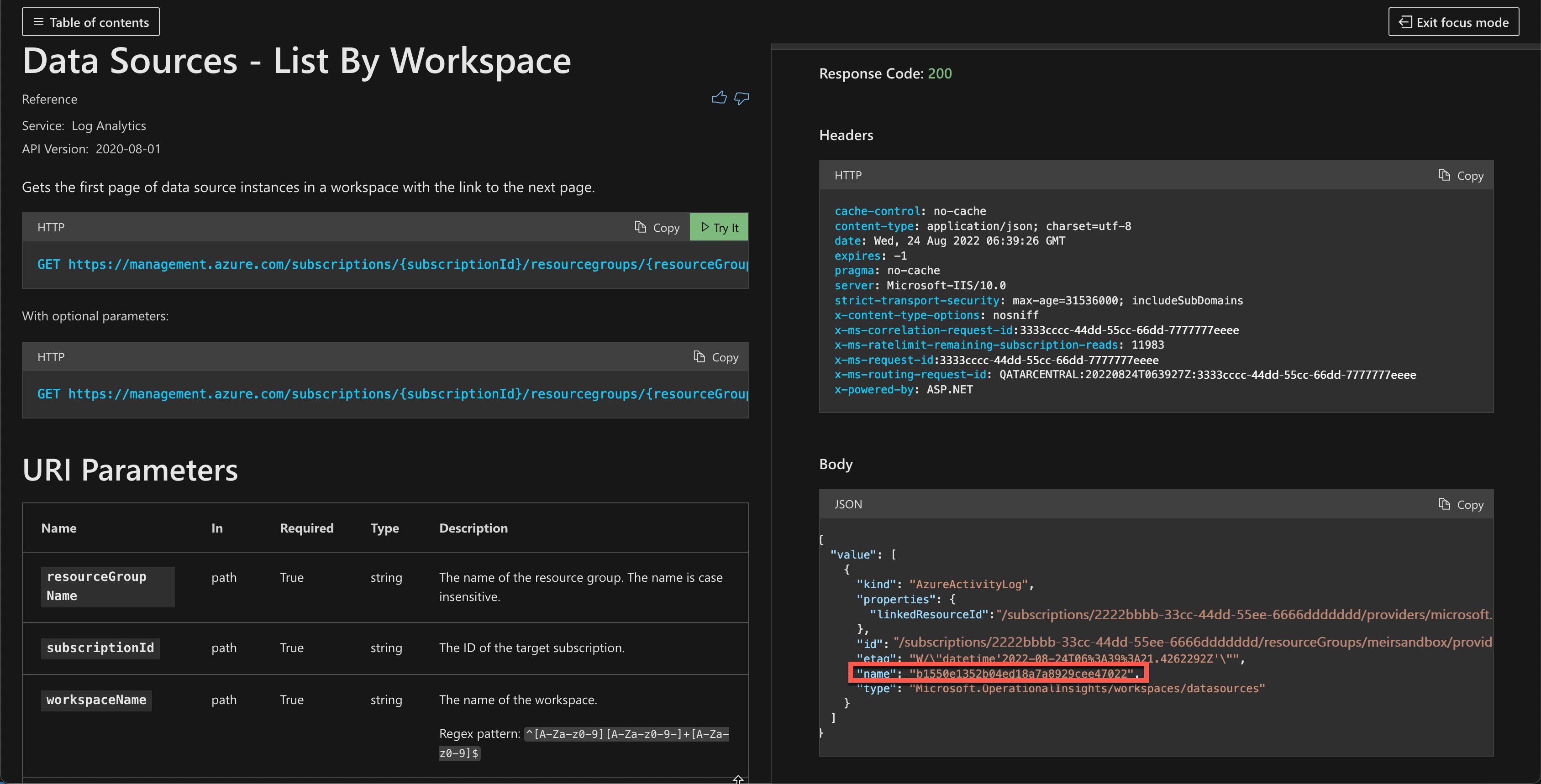 kind eq 'AzureActivityLog'来筛选出活动日志。从 API 响应中复制要禁用的连接的名称。