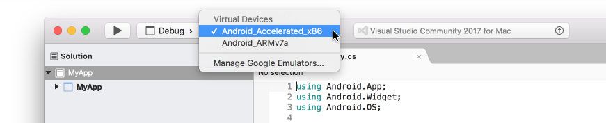 本指南介绍如何配置 Android Emulator,以便能够运行和测试 Xamarin.Android 应用。 其中介绍了使用预配置的虚拟设备启动仿真器的步骤,并提供了将应用程序从 Visual Studio 部署到仿真器的步骤。