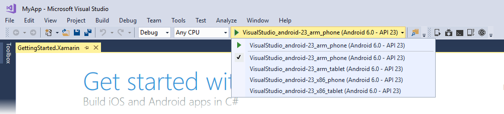 通常情况下,你会选择“VisualStudio_android-23_x86_phone”虚拟设备来测试和调试手机应用。 如果这些预配置虚拟设备中有一个能够满足需求(即与应用的目标 API 级别一致),请跳转到启动仿真器,开始在仿真器中运行应用。 (如果尚不熟悉 Android API 级别,请参阅了解 Android API 级别。)