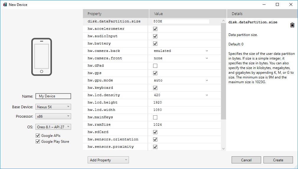 编辑需要修改的任何属性。 若要对属性进行更改,请参阅编辑 Android 虚拟设备属性。