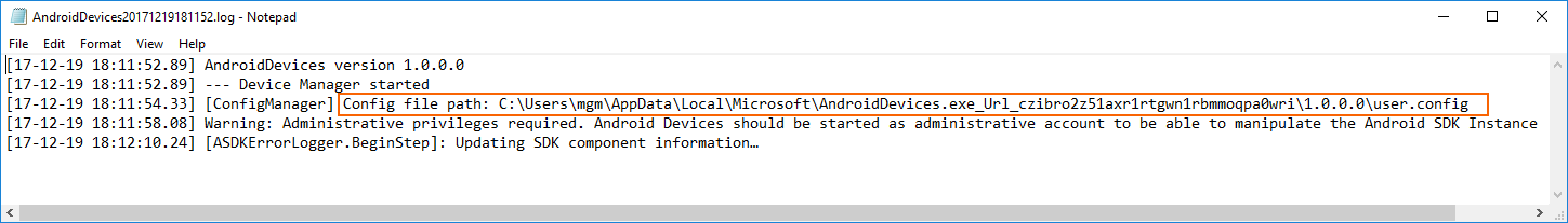 对 user.config 进行更改后,应该能够启动 Android Device Manager。