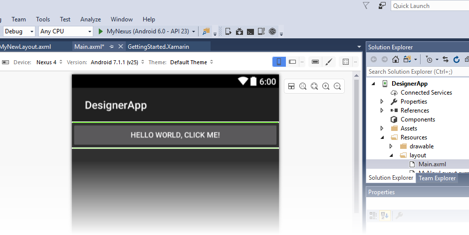这会创建新的 .axml 布局文件并将其加载到 Designer 中。