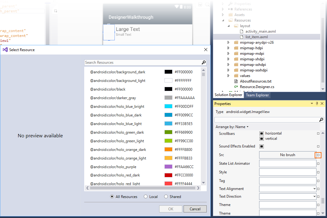 单击 Src 属性右侧的空白正方形可打开“选择资源”对话框,其中列出了从颜色(如上所示)到可绘制资源的各种资源。