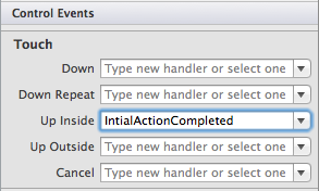 当用户释放 aButton 时,我们希望触发 TouchUpInside 事件。 让我们选择该按钮,然后在 Properties pad 的“事件”选项卡中,声明事件处理程序 InitialActionCompleted,以便可以在代码中引用它。 以下屏幕截图对此进行了说明:
