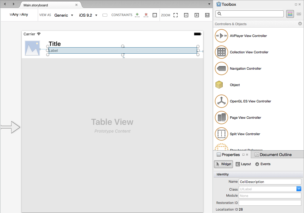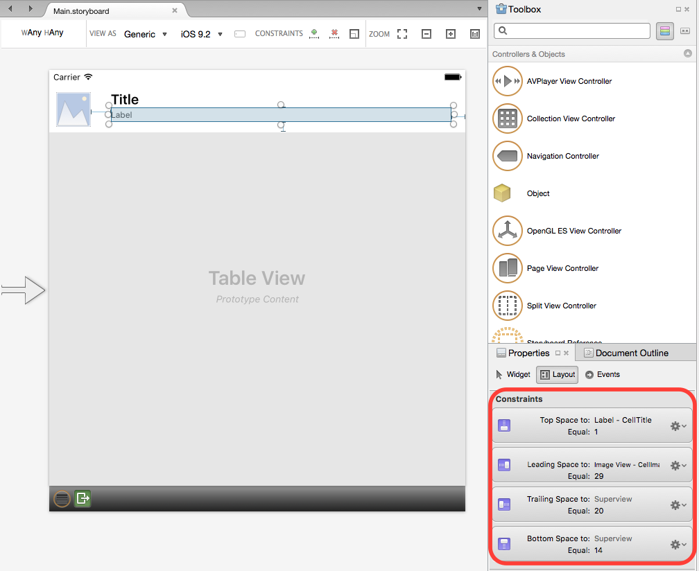 在 iOS 设计器中打开要自动调整行大小的表视图的情节提要,选择单元格的“原型”并设计单元格的布局。 例如: