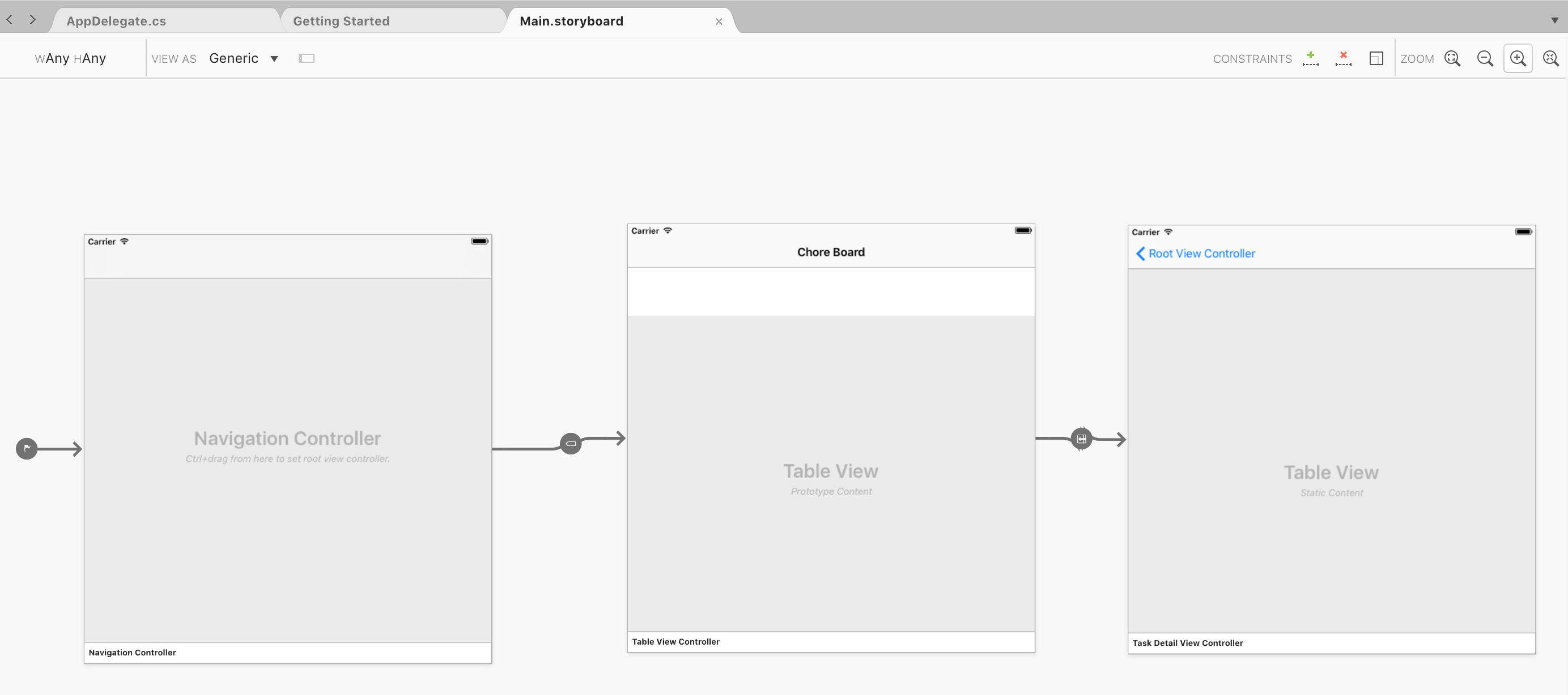 TaskDetailViewController.cs文件。 输入 StoryboardID 作为详细信息,如以下示例所示。 稍后将使用此信息在 C# 代码中加载此视图:情节提要设计界面现在应如下所示(根视图控制器的导航项标题已更改为“Chore Board”):