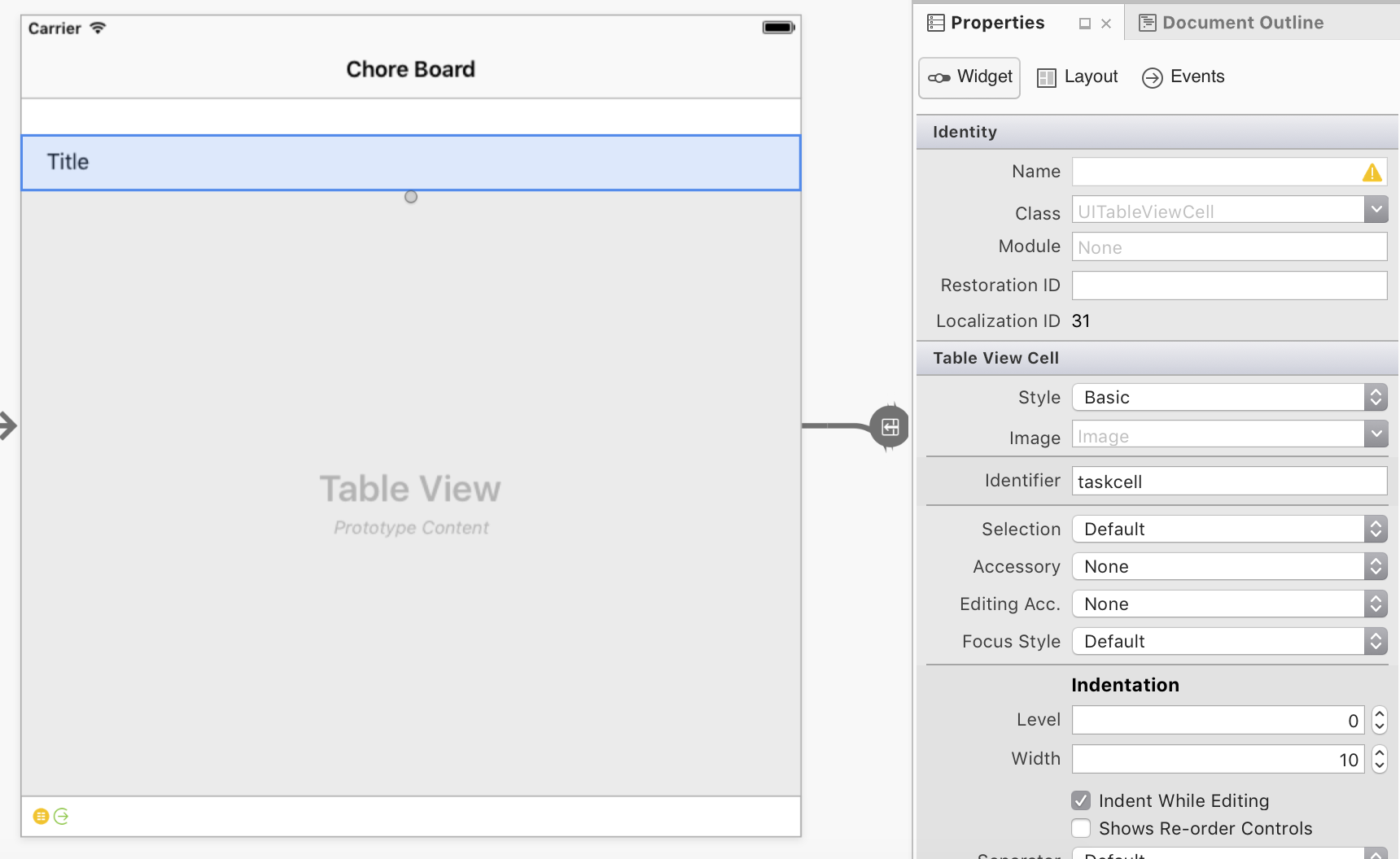 首先,在主视图控制器中选择原型单元格,并将“标识符”设置为 taskcell,如下所示。 稍后将在代码中使用此标识符来检索此 UITableViewCell 的实例:
