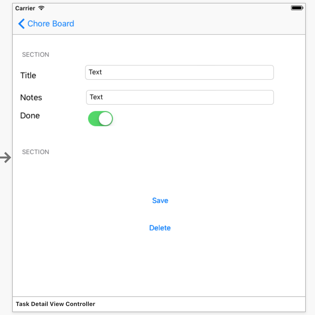 - 拖动所需控件以生成屏幕截图中所示的布局(将 UILabel、UITextField 和 UISwitch 放置在正确的单元格上,并适当地设置标签,即 Title、Notes 和 Done)。