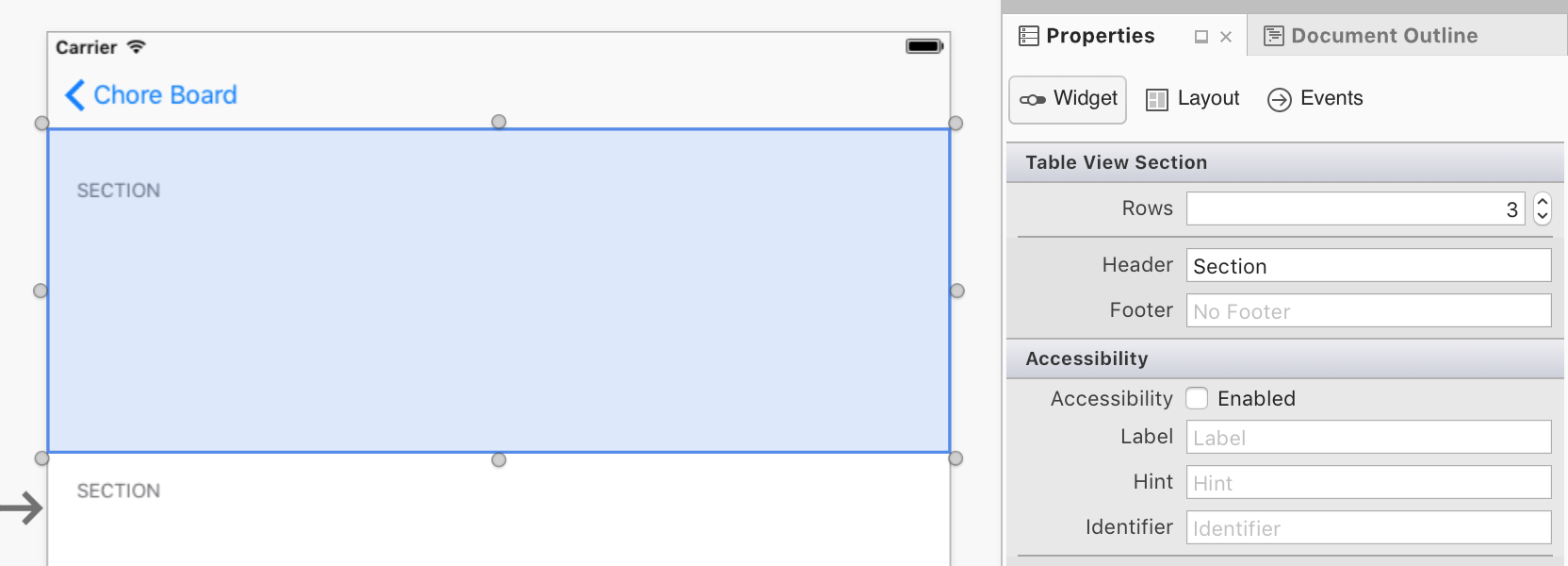 接下来,选择两个表视图并使用 Properties Pad 来配置它们。 请务必选择“视图”而不是“视图控制器”- 可以使用“文档大纲”来帮助做出选择。