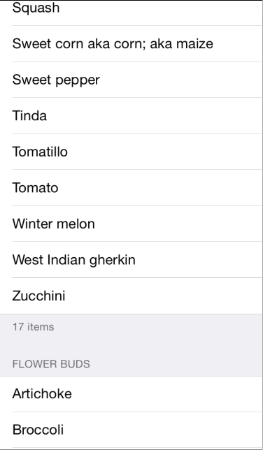 页眉和页脚可用于直观地对表中的行进行分组。 所需的数据结构与添加索引非常相似 - Dictionary<> 的效果非常好。 本示例不会使用字母表对单元格进行分组,而是按植物类型对蔬菜进行分组。