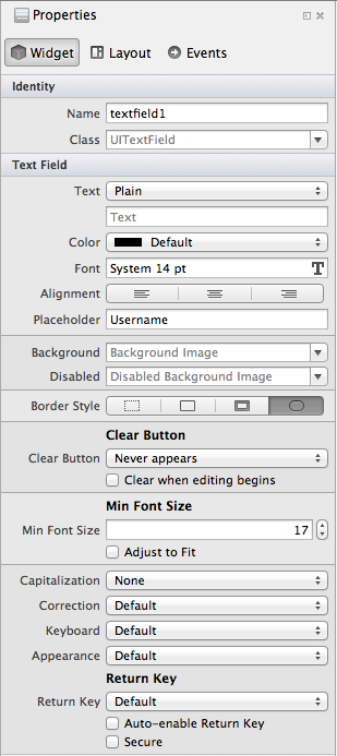 UITextField 控件通常用于接受单行文本输入,例如用户名或密码。 此处显示了可用于自定义控件的一些选项:
