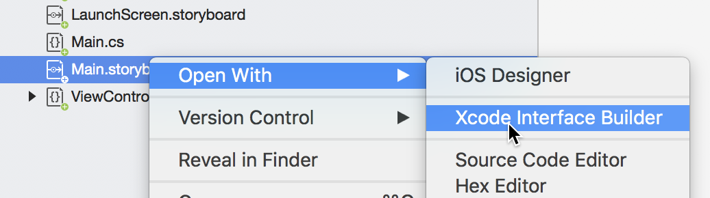 可以互换使用 iOS 设计器和 Xcode Interface Builder。 若要在 Xcode Interface Builder 中打开情节提要或 .xib 文件,请右键单击该文件并选择“打开方式”>“Xcode Interface Builder”,如以下屏幕截图所示:
