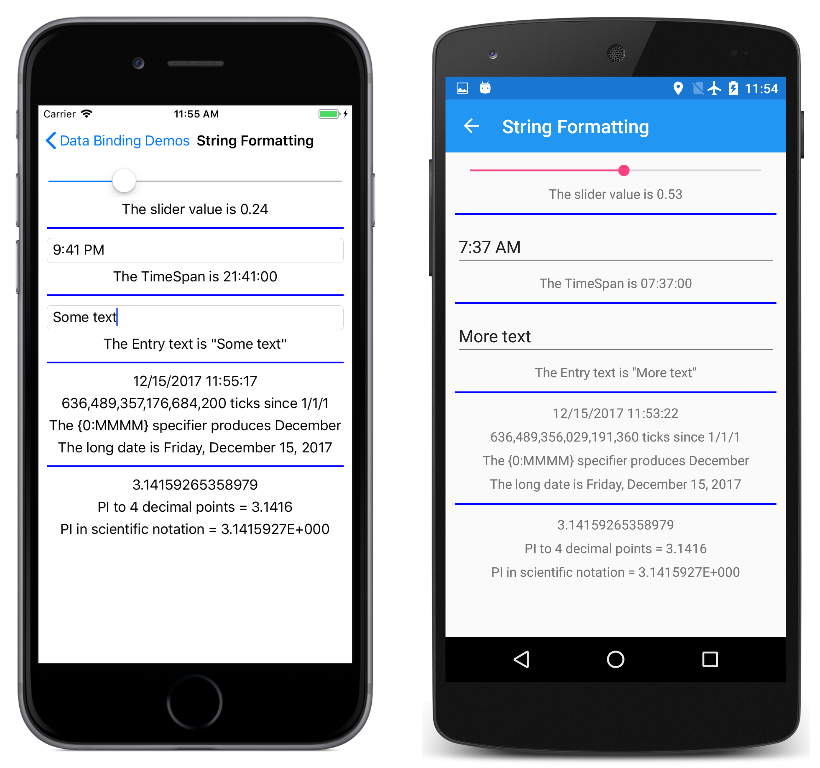 Slider 和 TimePicker 上的绑定显示了特定于 double 和 TimeSpan 数据类型的格式规范的用法。 显示 Entry 视图中文本的 StringFormat 演示了如何使用 " HTML 实体在格式设置字符串中指定双引号。