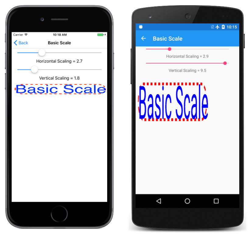 “基本缩放”页演示了 Scale 方法。 BasicScalePage.xaml 文件包含两个 Slider 元素,可用于选择介于 0 和 10 之间的水平和垂直缩放因子。 BasicScalePage.xaml.cs 代码隐藏文件使用这些值来调用 Scale,然后显示用虚线绘制的圆角矩形,并调整大小以适应画布左上角的某些文本: