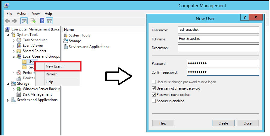 在“用户名”框中,输入 repl_snapshot,提供密码和其他相关信息,然后选择“创建”来创建 repl_snapshot 帐户: