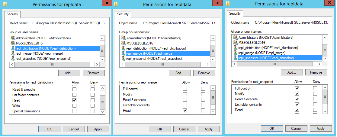 在复制教程中,发布服务器和分发服务器共享同一 SQL Server 实例 (NODE1\SQL2016)。 订阅服务器实例 (NODE2\SQL2016) 是远程实例。 发布服务器和订阅服务器可能共享 SQL Server 的同一实例,但这不是必需的。 如果发布服务器和订阅服务器共享同一实例,则不需要在订阅服务器上创建帐户的步骤。